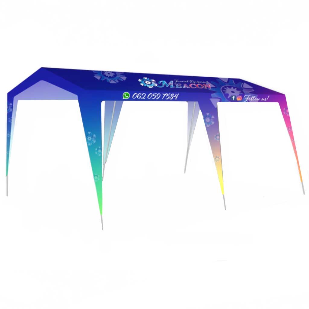 Large Polytex gazebo with full-colour branding across the canopy. Built for strong visual presence at events, funerals, and promotional setups.